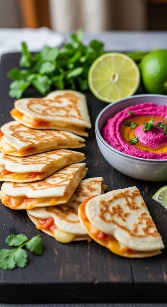 For a playful, casual vibe — especially if your date night is more Netflix than candlelit dinner — heart-shaped quesadillas are the move. Use a heart-shaped cookie cutter on flour tortillas before or after grilling, fill with your favorite melty cheese and a little smoked chicken or roasted peppers, and serve with a pink beet hummus or chipotle dipping sauce.
