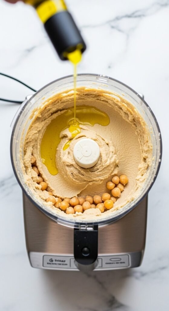 Blending in a small amount of a starchy ingredient works wonders, especially for hummus or bean-based dips: