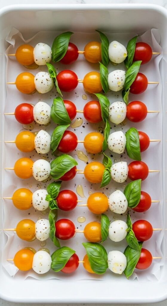 - Toothpick appetizers (like bruschetta bites or caprese stacks) travel best laid flat in a single layer with parchment between rows.